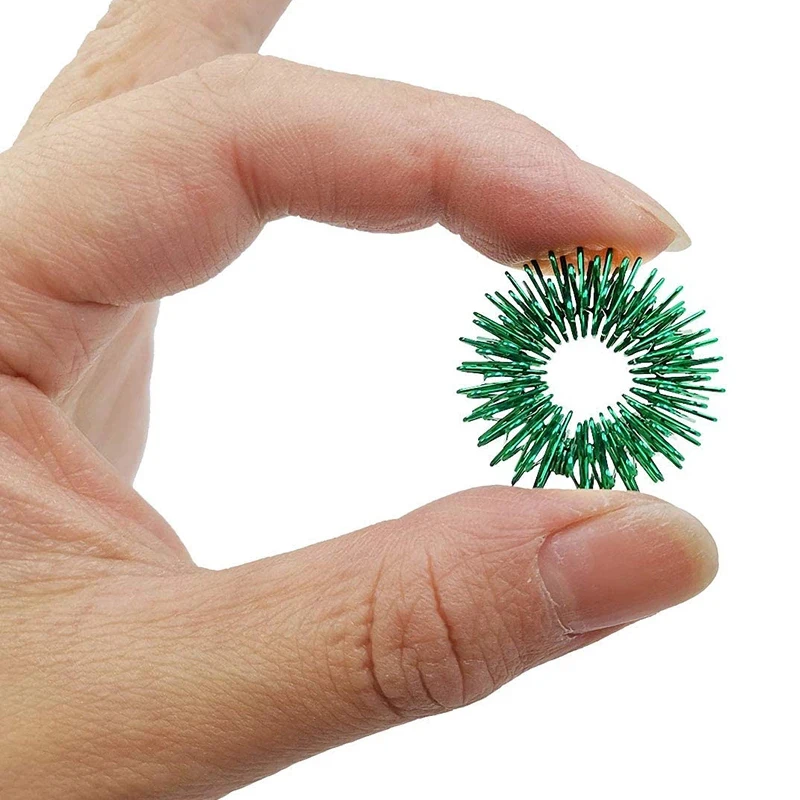 Contrairement aux anneaux lisses basiques, nos anneaux comportent des picots spécialement conçus pour masser les doigts. Cette texture unique stimule les terminaisons nerveuses et les points d’acupression, procurant une sensation immédiatement apaisante. Le massage continu favorise la circulation sanguine et crée un retour sensoriel riche qui calme l’anxiété et améliore la concentration. Texture douce mais stimulante, parfaite pour tous les âges.